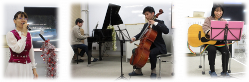 第2部では日本人学生と韓国からの留学生がチェロとピアノのアンサンブルを披露し、柔らかな音色で参加者全員を魅了しました。教員によるジブリ曲の弾き語りは音符一つひとつに温かさが込められ、研究員による心に響く美しい歌声もきくことができました。
