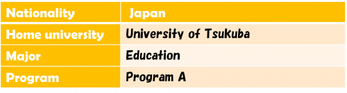 In my academic life, I was able to deepen my understanding of education while interacting with students from more than 20 countries and regions. For example, during a class discussion on the topic of education policy, I was particularly impressed by how the discussion became multifaceted, as each student shared perspectives shaped by their own cultural backgrounds and upbringings. I felt that being in an environment where I could directly observe and learn about the cultures, lifestyles, and diverse viewpoints of people from around the world was something that would be difficult to experience if I had stayed only in Japan. In addition to my studies, I also had many opportunities for communicating with many friends, such as participating in club activities and sharing meals with friends and professors after class. I especially enjoyed chatting with friends during breaks.